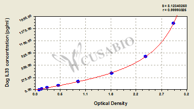 To assess the linearity of the assay, samples were spiked with high concentrations of dog IL33 in various matrices and diluted with the Sample Diluent to produce samples with values within the dynamic range of the assay. Sample Serum(n=4) 1:1 Average % 85 Range % 82-89 1:2 Average % 102 Range % 97-107 1:4 Average % 89 Range % 85-93 1:8 Average % 96 Range % 93-90 -