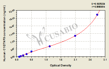 To assess the linearity of the assay, samples were spiked with high concentrations of human C1QTNF9 in various matrices and diluted with the Sample Diluent to produce samples with values within the dynamic range of the assay. Sample Serum(n=4) 1:1 Average % 97 Range % 91-101 1:2 Average % 101 Range % 95-104 1:4 Average % 92 Range % 85-95 1:8 Average % 100 Range % 94-103 -