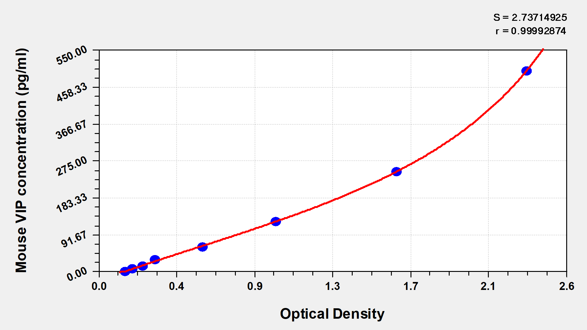 To assess the linearity of the assay, samples were spiked with high concentrations of mouse VIP in various matrices and diluted with the Sample Diluent to produce samples with values within the dynamic range of the assay.