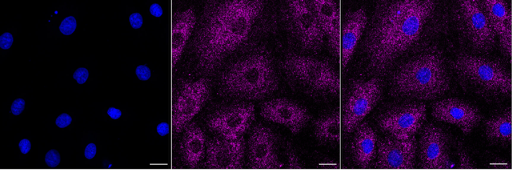 Immunocytochemical staining of H9C2 cells with ABCF2 antibody. Nuclei were stained blue with DAPI; ABCF2 was stained magenta with Alexa Fluor? 647. Images were taken using Leica stellaris 5. Protein abundance based on laser Intensity and smart gain:Medium. Scale bar, 20 μm.