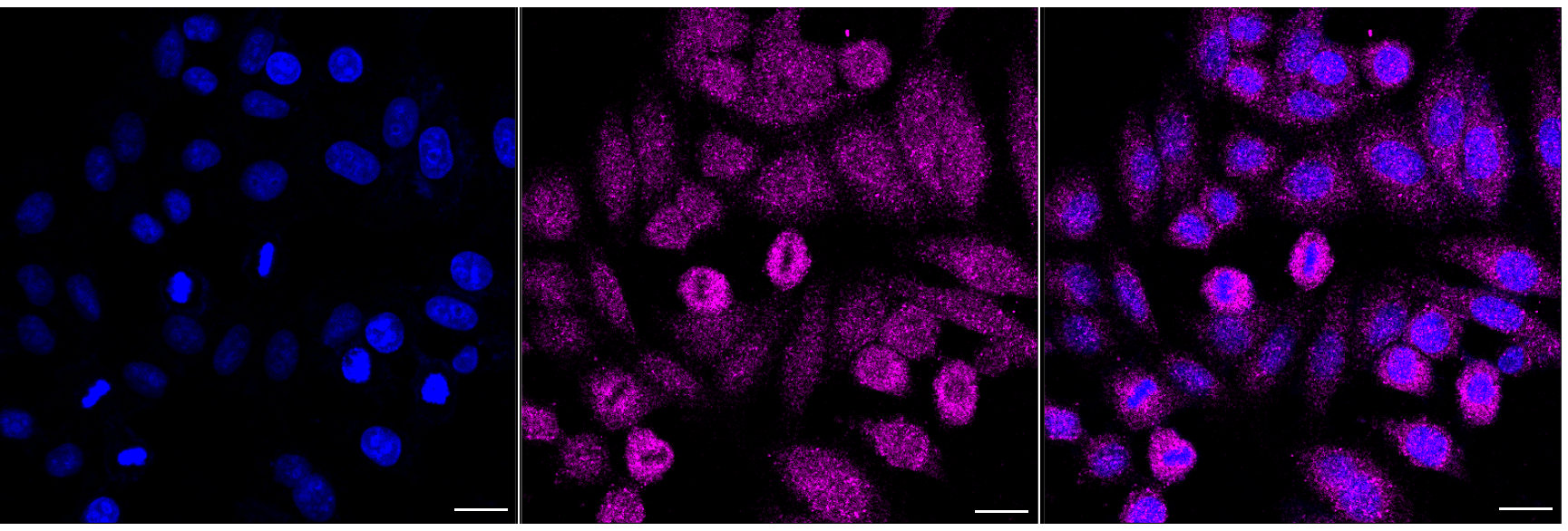 Immunocytochemical staining of HepG2 cells with aminoacylase 1 antibody. Nuclei were stained blue with DAPI; aminoacylase 1 was stained magenta with Alexa Fluor? 647. Images were taken using Leica stellaris 5. Protein abundance based on laser Intensity and smart gain:Low. Scale bar, 20 μm.