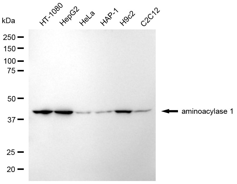 Western blotting analysis using aminoacylase 1 antibody. Total cell lysates (30 μg) from various cell lines were loaded and separated by SDS-PAGE. The blot was incubated with aminoacylase 1 antibody and HRP-conjugated goat anti-mouse secondary antibody respectively.