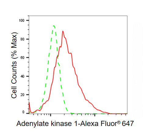 Flow cytometric analysis of Adenylate kinase 1 expression in HepG2 cells using Adenylate kinase 1 antibody. Green, isotype control; red,Adenylate kinase 1.