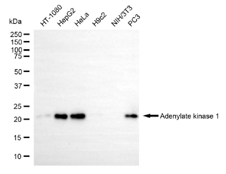 Western blotting analysis using adenylate kinase 1 antibody. Total cell lysates (30 μg) from various cell lines were loaded and separated by SDS-PAGE. The blot was incubated with adenylate kinase 1 antibody and HRP-conjugated goat anti-mouse secondary antibody respectively.