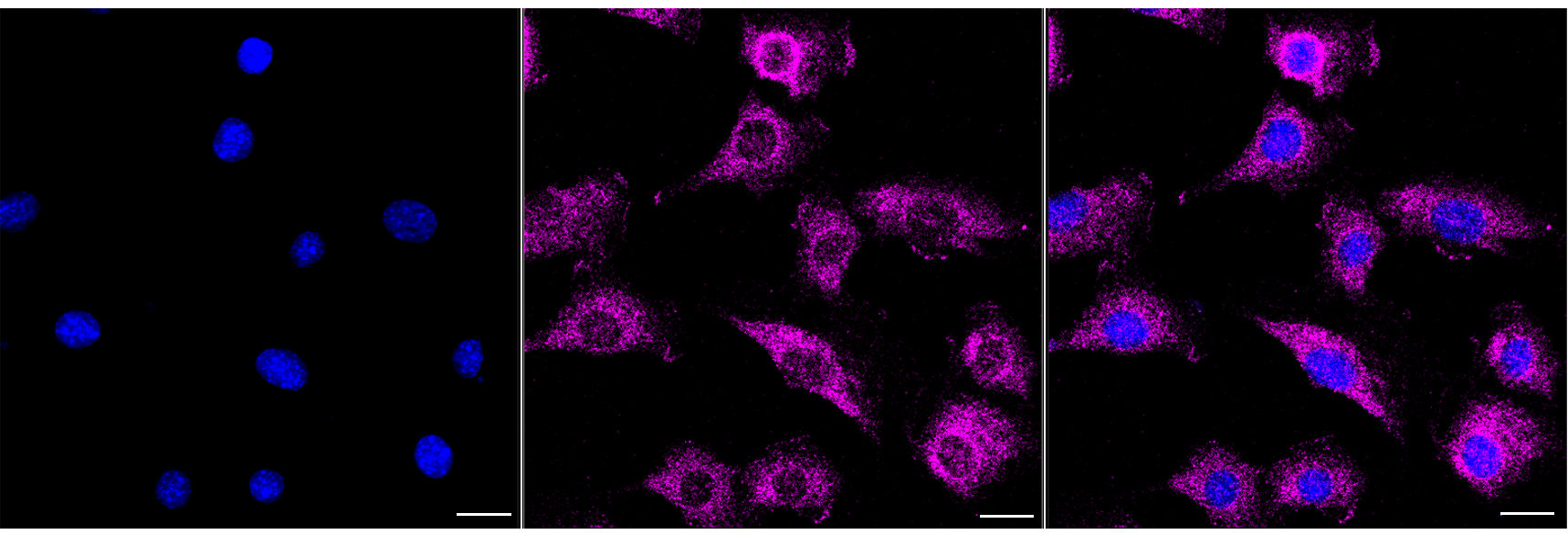 Immunocytochemical staining of C2C12 cells with Adenylate kinase 3 antibody. Nuclei were stained blue with DAPI; Adenylate kinase 3 was stained magenta with Alexa Fluor? 647. Images were taken using Leica stellaris 5. Protein abundance based on laser Intensity and smart gain: Medium. Scale bar, 20 μm.