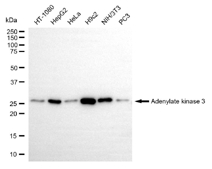 Western blotting analysis using adenylate kinase 3 antibody. Total cell lysates (30 μg) from various cell lines were loaded and separated by SDS-PAGE. The blot was incubated with adenylate kinase 3 antibody and HRP-conjugated goat anti-mouse secondary antibody respectively.