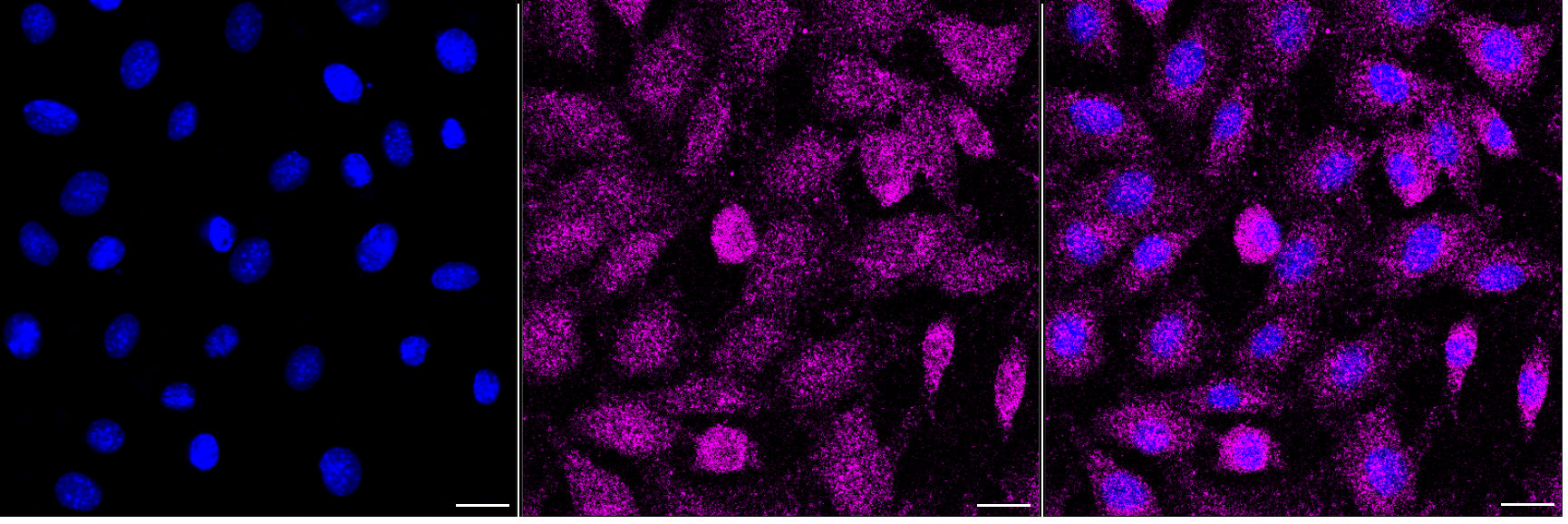 Immunocytochemical staining of C2C12 cells with AKT3 antibody. Nuclei were stained blue with DAPI;AKT3 was stained magenta with Alexa Fluor? 647. Images were taken using Leica stellaris 5. Protein abundance based on laser Intensity and smart gain: Medium. Scale bar, 20 μm.