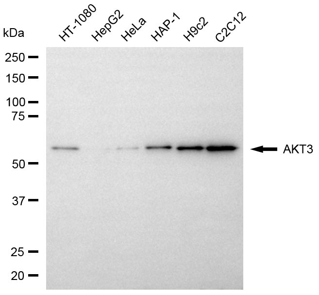 Western blotting analysis using AKT3 antibody. Total cell lysates (30 μg) from various cell lines were loaded and separated by SDS-PAGE. The blot was incubated with AKT3 antibody and HRP-conjugated goat anti-mouse secondary antibody respectively.