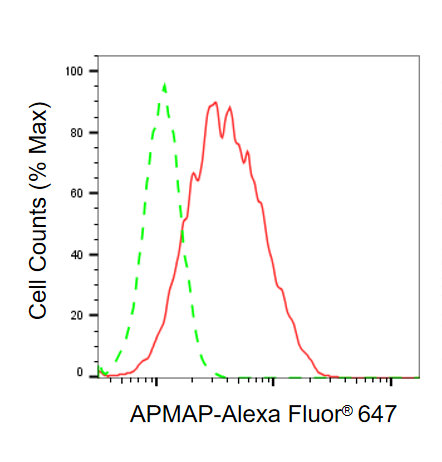 Flow cytometric analysis of APMAP expression in HT-1080 cells using APMAP antibody. Green, isotype control; red, APMAP.