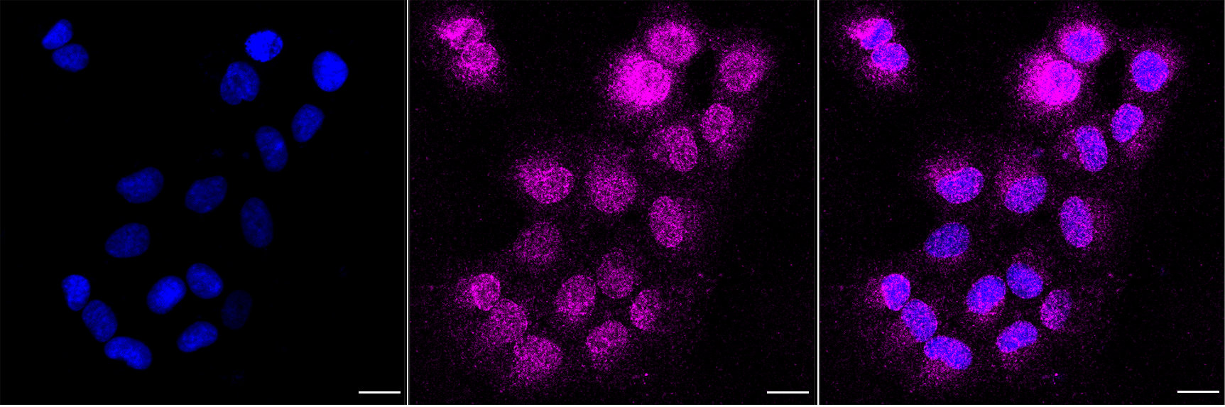 Immunocytochemical staining of HT-1080 cells with APMAP antibody. Nuclei were stained blue with DAPI; APMAP was stained magenta with Alexa Fluor? 647. Images were taken using Leica stellaris 5. Protein abundance based on laser Intensity and smart gain: Medium. Scale bar, 20 μm.