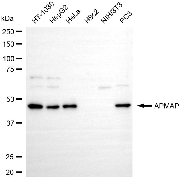 Western blotting analysis using APMAP antibody. Total cell lysates (30 μg) from various cell lines were loaded and separated by SDS-PAGE. The blot was incubated with APMAP antibody and HRP-conjugated goat anti-mouse secondary antibody respectively.