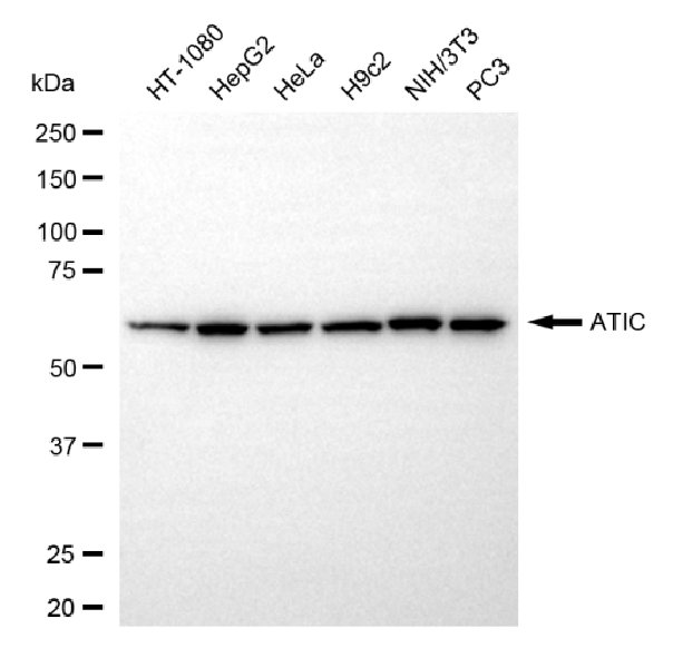 Western blotting analysis using ATIC antibody. Total cell lysates (30 μg) from various cell lines were loaded and separated by SDS-PAGE. The blot was incubated with ATIC antibody and HRP-conjugated goat anti-mouse secondary antibody respectively.