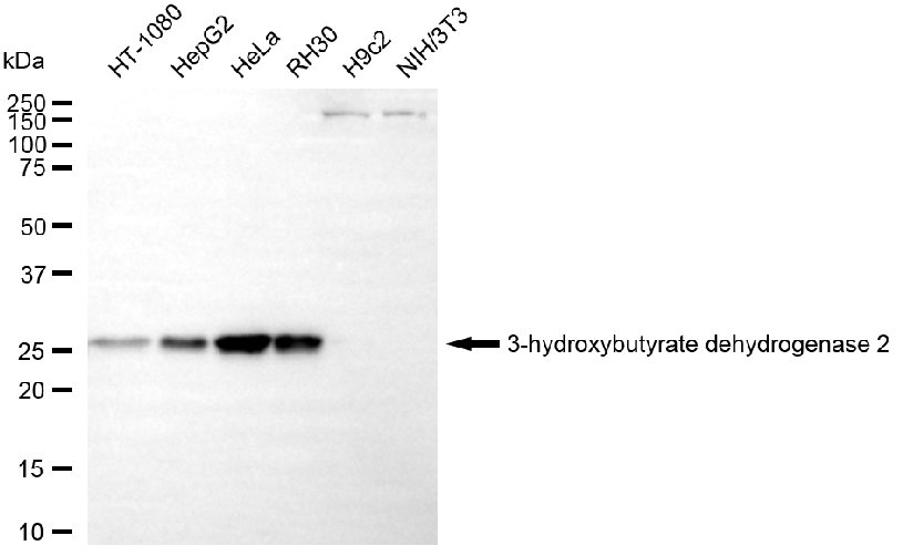 Western blotting analysis using 3-hydroxybutyrate dehydrogenase 2 antibody. Total cell lysates (30 μg) from various cell lines were loaded and separated by SDS-PAGE. The blot was incubated with 3-hydroxybutyrate dehydrogenase 2 antibody and HRP-conjugated goat anti-mouse secondary antibody respectively.