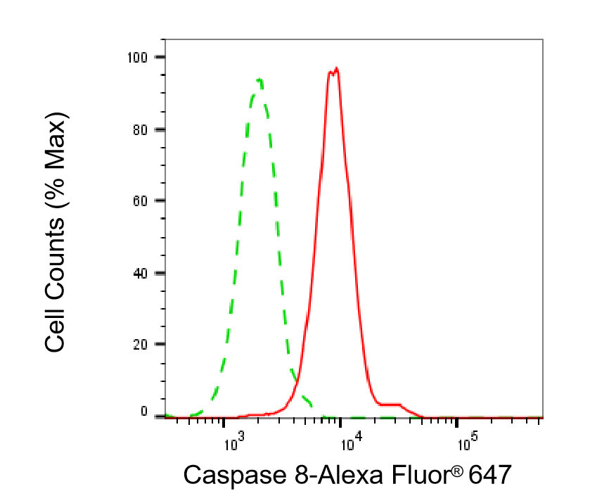 Flow cytometric analysis of Caspase 8 expression in HeLa cells using Caspase 8 antibody. Green, isotype control; red, Caspase 8.