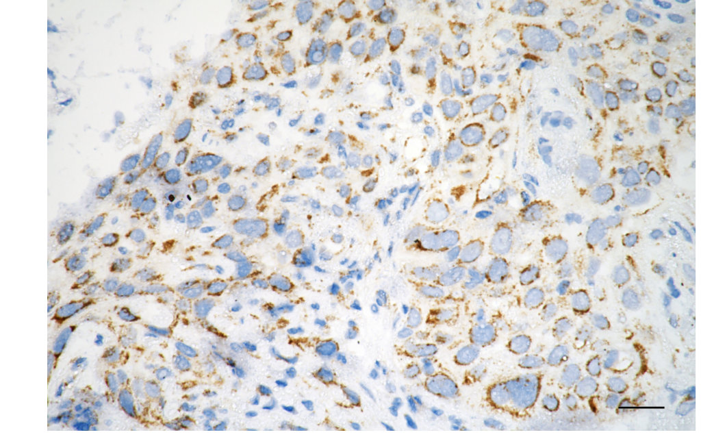 Immunohistochemistry was performed on paraffin-embedded human esophageal carcinoma using caspase 8 antibody. Antigen retrieval was done in sodium citrate buffer (pH 6.0). DAB was used for detection, with hematoxylin counterstaining. Images were acquired using a Nikon Ci-L Plus microscope (40× objective). Scale bar: 25 μm.