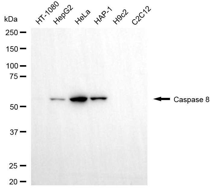 Western blotting analysis using caspase 8 antibody. Total cell lysates (30 μg) from various cell lines were loaded and separated by SDS-PAGE. The blot was incubated with caspase 8 antibody and HRP-conjugated goat anti-mouse secondary antibody respectively.