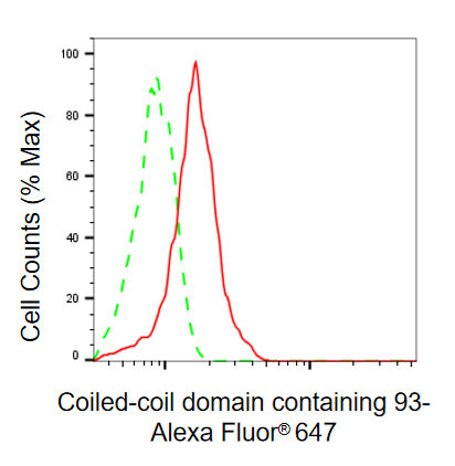 Flow cytometric analysis of Coiled-coil domain containing 93 expression in HeLa cells using Coiled-coil domain containing 93 antibody. Green, isotype control; red, Coiled-coil domain containing 93.