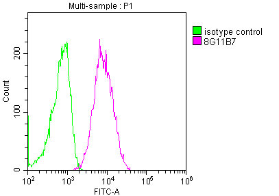 Overlay histogram showing Raji cells stained with CSB-MA004888A0m (red line) at 1:100. The cells were incubated in 1x PBS /10% normal goat serum to block non-specific protein-protein interactions followed by primary antibody for 1 h at 4°C. The secondary antibody used was FITC goat anti-mouse IgG(H+L) at 1/200 dilution for 1 h at 4°C. Isotype control antibody (green line) was used under the same conditions. Acquisition of >10,000 events was performed.