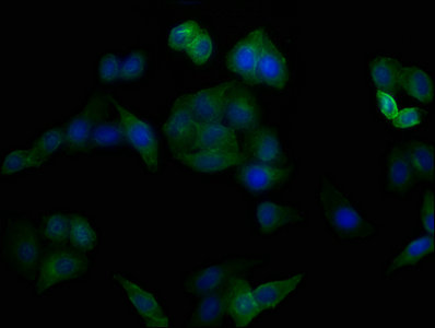 Immunofluorescence staining of MCF-7 cells with CSB-MA004938A0m at 1:100, counter-stained with DAPI. The cells were blocked in 10% normal Goat Serum and then incubated with the primary antibody overnight at 4°C. The secondary antibody was Alexa Fluor 488-congugated AffiniPure Goat Anti-Mouse IgG(H+L).