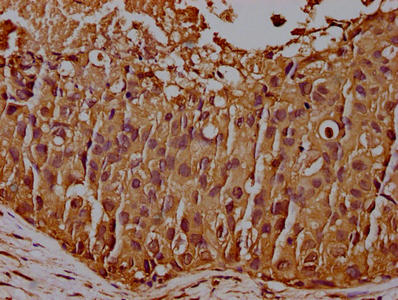 IHC image of CSB-MA004938A0m diluted at 1:100 and staining in paraffin-embedded human skin tissue performed on a Leica BondTM system. After dewaxing and hydration, antigen retrieval was mediated by high pressure in a citrate buffer (pH 6.0). Section was blocked with 10% normal goat serum 30min at RT. Then primary antibody (1% BSA) was incubated at 4°C overnight. The primary is detected by a biotinylated secondary antibody and visualized using an HRP conjugated SP system.