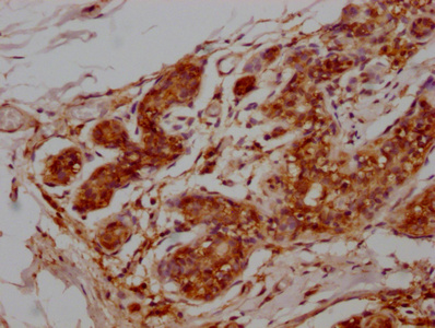 IHC image of MA004969A0m diluted at 1:50 and staining in paraffin-embedded human breast cancer tissue performed on a Leica BondTM system. After dewaxing and hydration, antigen retrieval was mediated by high pressure in a citrate buffer (pH 6.0). Section was blocked with 10% normal goat serum 30min at 37°C. Then primary antibody (1% BSA) was incubated at 4°C overnight. The primary is detected by a Goat anti-rabbit IgG labeled by HRP and visualized using 0.05% DAB.