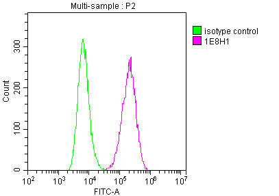 Overlay histogram showing U87 cells stained with CSB-MA004969A1m (red line) at 1:100. The cells were fixed in 4% formaldehyde and permeated by 0.2% TritonX-100. Then 10% normal goat serum was Incubated to block non-specific protein-protein interactions followed by the antibody (1μg/1*106cells) for 1 h at 4°C. The secondary antibody used was FITC-conjugated Goat Anti-Mouse IgG(H+L) at 1/100 dilution for 30min at 4°C. Isotype control antibody (green line) was mouse IgG1 (1μg/1*106cells) used under the same conditions. Acquisition of >10,000 events was performed.