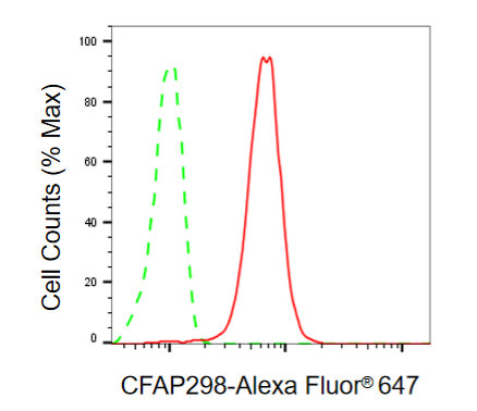Flow cytometric analysis of CFAP298 expression in HepG2 cells using CFAP298 antibody. Green, isotype control; red, CFAP298.