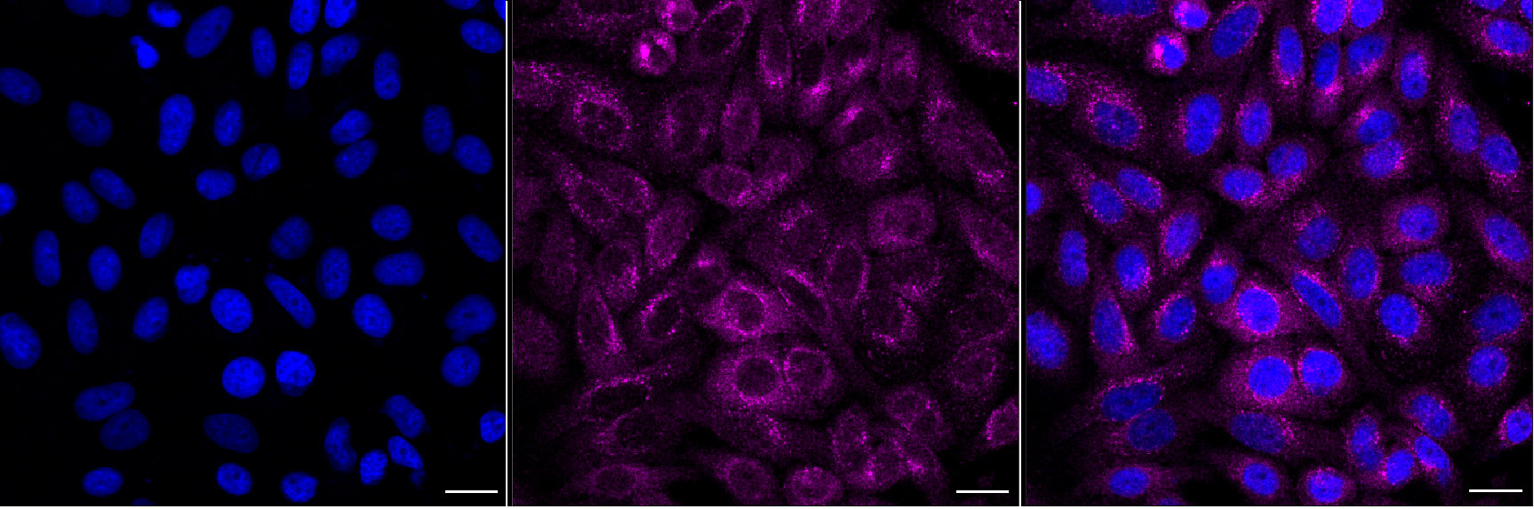 Immunocytochemical staining of HepG2 cells with Copper metabolism domain containing 1 antibody. Nuclei were stained blue with DAPI; Copper metabolism domain containing 1 was stained magenta with Alexa Fluor? 647. Images were taken using Leica stellaris 5. Protein abundance based on laser Intensity and Smart Gain:Medium. Scale bar, 20 μm.