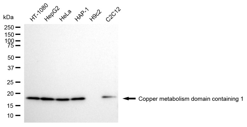 Western blotting analysis using copper metabolism domain containing 1 antibody. Total cell lysates (30 μg) from various cell lines were loaded and separated by SDS-PAGE. The blot was incubated with copper metabolism domain containing 1 antibody and HRP-conjugated goat anti-mouse secondary antibody respectively.