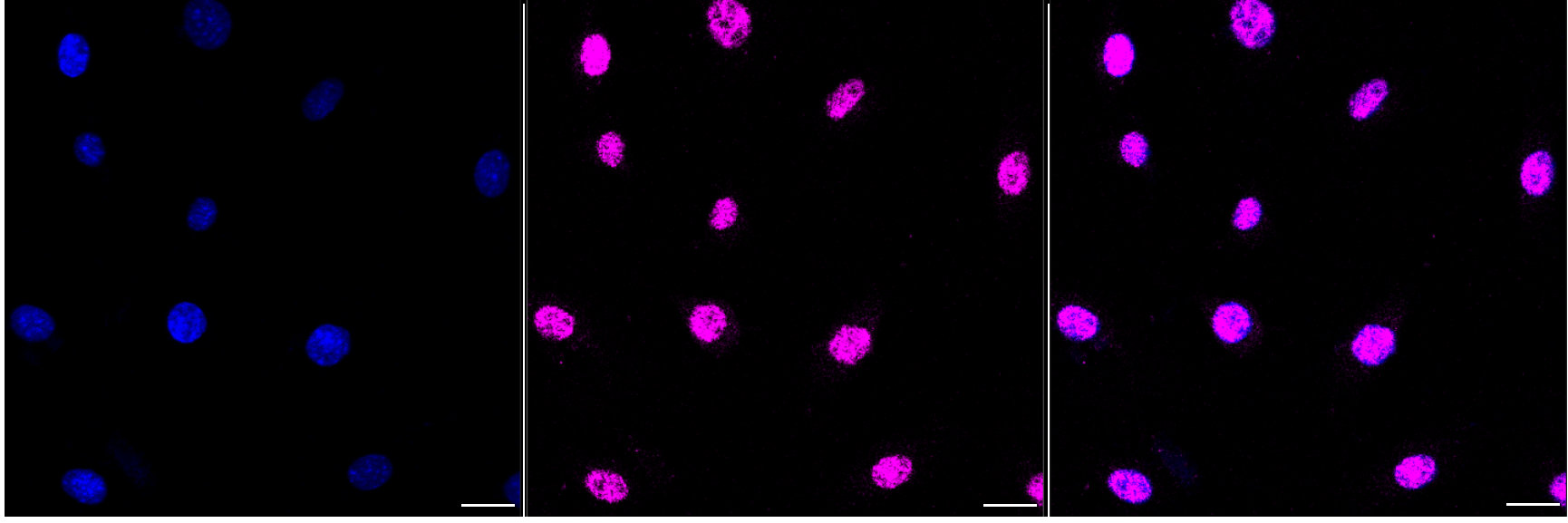 Immunocytochemical staining of C2C12 cells with CREB1 antibody. Nuclei were stained blue with DAPI;CREB1 was stained magenta with Alexa Fluor? 647. Images were taken using Leica stellaris 5. Protein abundance based on laser Intensity and smart gain: Medium. Scale bar, 20 μm.
