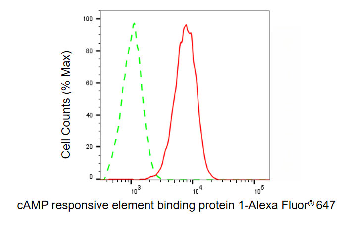 Flow cytometric analysis of cAMP responsive element binding protein 1 expression in C2C12 cells using cAMP responsive element binding protein 1 antibody. Green, isotype control; red, cAMP responsive element binding protein 1.