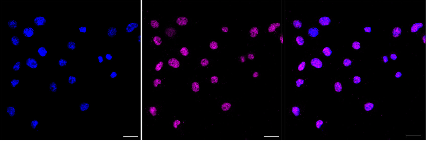 Immunocytochemical staining of C2C12 cells with CAMP responsive element binding protein 1 antibody. Nuclei were stained blue with DAPI; CAMP responsive element binding protein 1 was stained magenta with Alexa Fluor? 647. Images were taken using Leica stellaris 5. Protein abundance based on laser Intensity and smart gain: Medium. Scale bar, 20 μm.