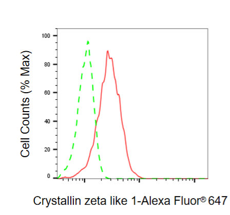 Flow cytometric analysis of Crystallin zeta like 1 expression in HeLa cells using Crystallin zeta like 1 antibody. Green, isotype control; red, Crystallin zeta like 1.