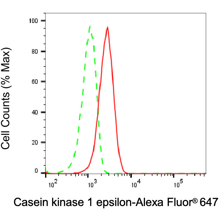 Flow cytometric analysis of Casein kinase 1 epsilon expression in HT-1080 cells using Casein kinase 1 epsilon antibody. Green, isotype control; red, Casein kinase 1 epsilon.
