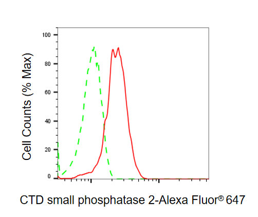 Flow cytometric analysis of CTD small phosphatase 2 expression in HepG2 cells using CTD small phosphatase 2 antibody. Green, isotype control; red, CTD small phosphatase 2.
