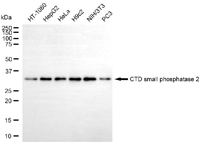 Western blotting analysis using CTD small phosphatase 2 antibody. Total cell lysates (30 μg) from various cell lines were loaded and separated by SDS-PAGE. The blot was incubated with CTD small phosphatase 2 antibody and HRP-conjugated goat anti-mouse secondary antibody respectively.