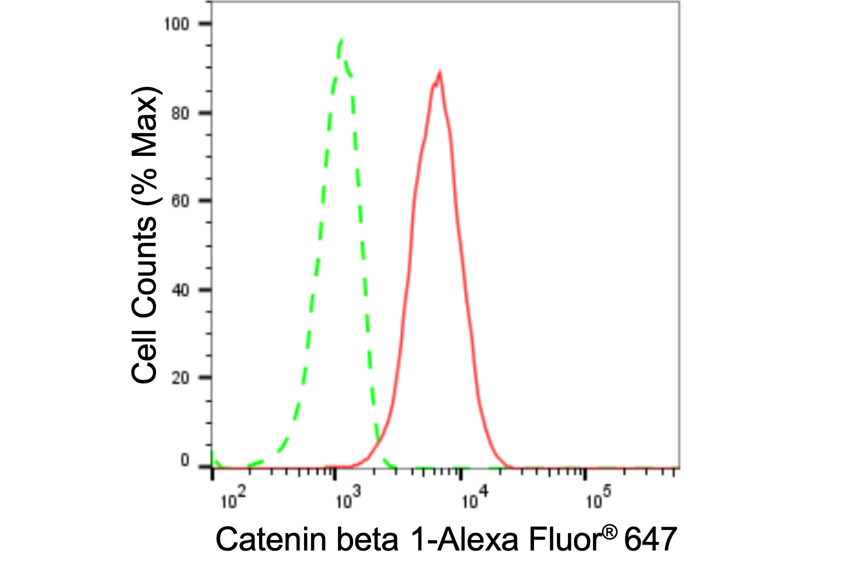 Flow cytometric analysis of Catenin beta 1 expression in HT-1080 cells using Catenin beta 1 antibody. Green, isotype control; red, Catenin beta 1.