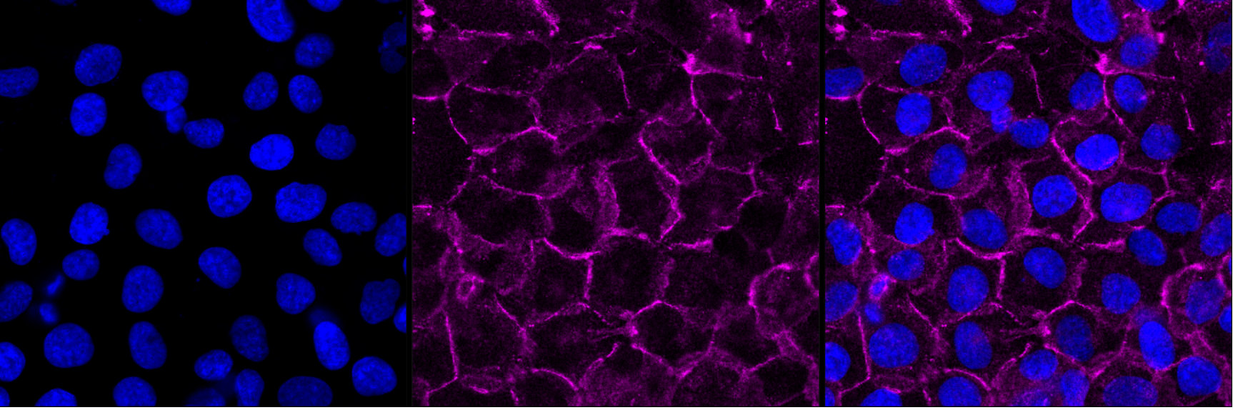 Immunocytochemical staining of HT-1080 cells with Catenin beta 1 antibody. Nuclei were stained blue with DAPI; Catenin beta 1 was stained magenta with Alexa Fluor? 647. Images were taken using Leica stellaris 5. Protein abundance based on laser Intensity and Smart Gain:Medium. Scale bar, 20 μm.