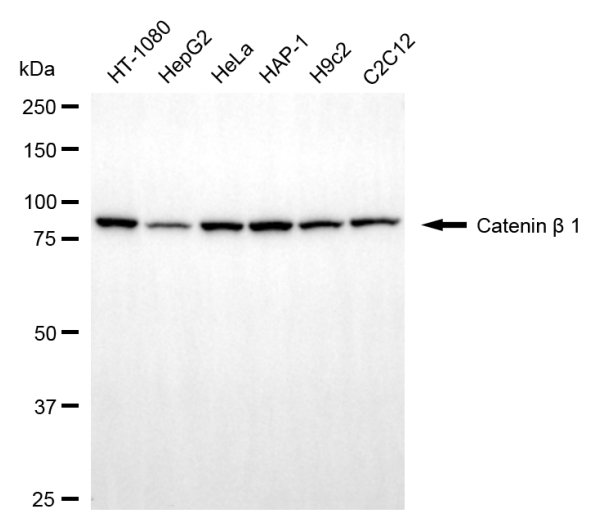Western blotting analysis using catenin beta 1 antibody. Total cell lysates (30 μg) from various cell lines were loaded and separated by SDS-PAGE. The blot was incubated with catenin beta 1 antibody and HRP-conjugated goat anti-mouse secondary antibody respectively.
