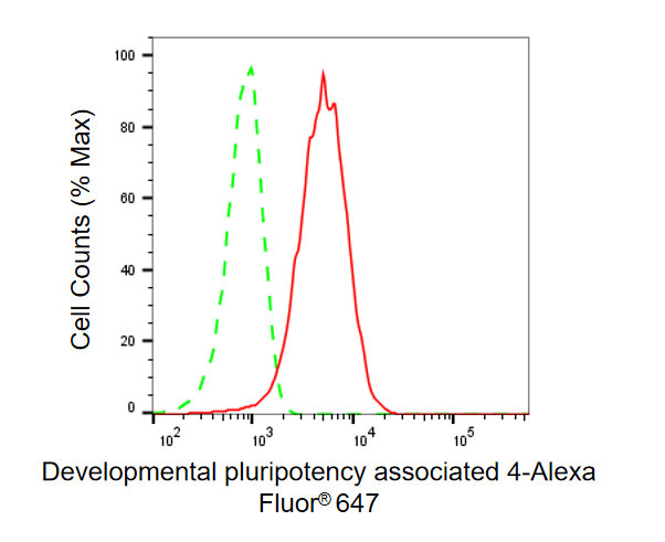Flow cytometric analysis of Developmental pluripotency associated 4 expression in HAP-1 cells using Developmental pluripotency associated 4 antibody. Green, isotype control; red, Developmental pluripotency associated 4.