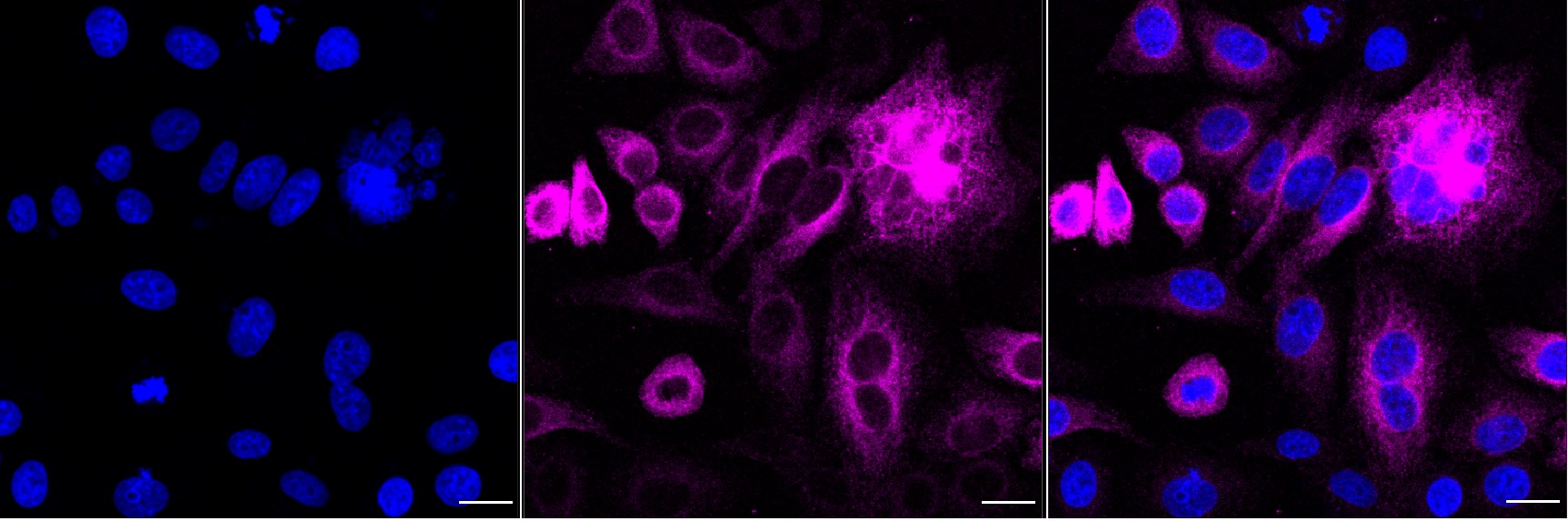 Immunocytochemical staining of HepG2 cells with Epidermal growth factor receptor antibody. Nuclei were stained blue with DAPI; Epidermal growth factor receptor was stained magenta with Alexa Fluor? 647. Images were taken using Leica stellaris 5. Protein abundance based on laser Intensity and Smart Gain: Medium. Scale bar, 20 μm.