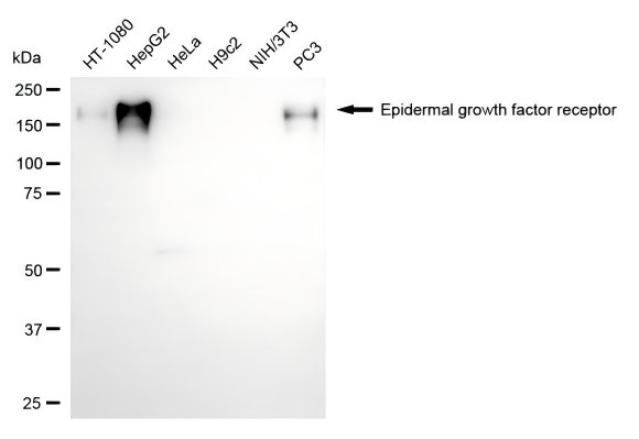 Western blotting analysis using epidermal growth factor receptor antibody. Total cell lysates (30 μg) from various cell lines were loaded and separated by SDS-PAGE. The blot was incubated with epidermal growth factor receptor antibody and HRP-conjugated goat anti-mouse secondary antibody respectively.