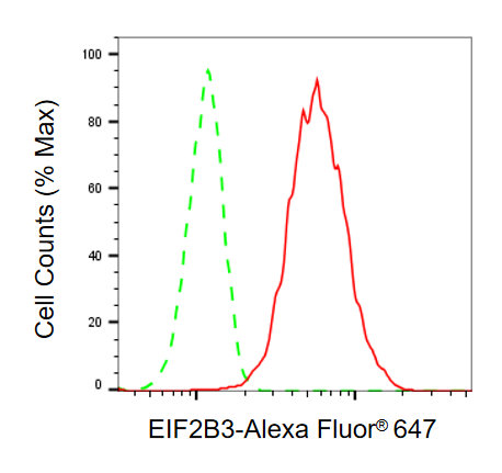 Flow cytometric analysis of EIF2B3 expression in C2C12 cells using EIF2B3 antibody. Green, isotype control; red, EIF2B3.