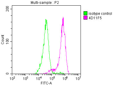 Overlay histogram showing Hela cells stained with CSB-MA007670A1m (red line) at 1:550. The cells were incubated in 1x PBS /10% normal goat serum to block non-specific protein-protein interactions followed by primary antibody for 1 h at 4°C. The secondary antibody used was FITC goat anti-mouse IgG(H+L) at 1/200 dilution for 1 h at 4°C. Isotype control antibody (green line) was used under the same conditions. Acquisition of >10,000 events was performed.
