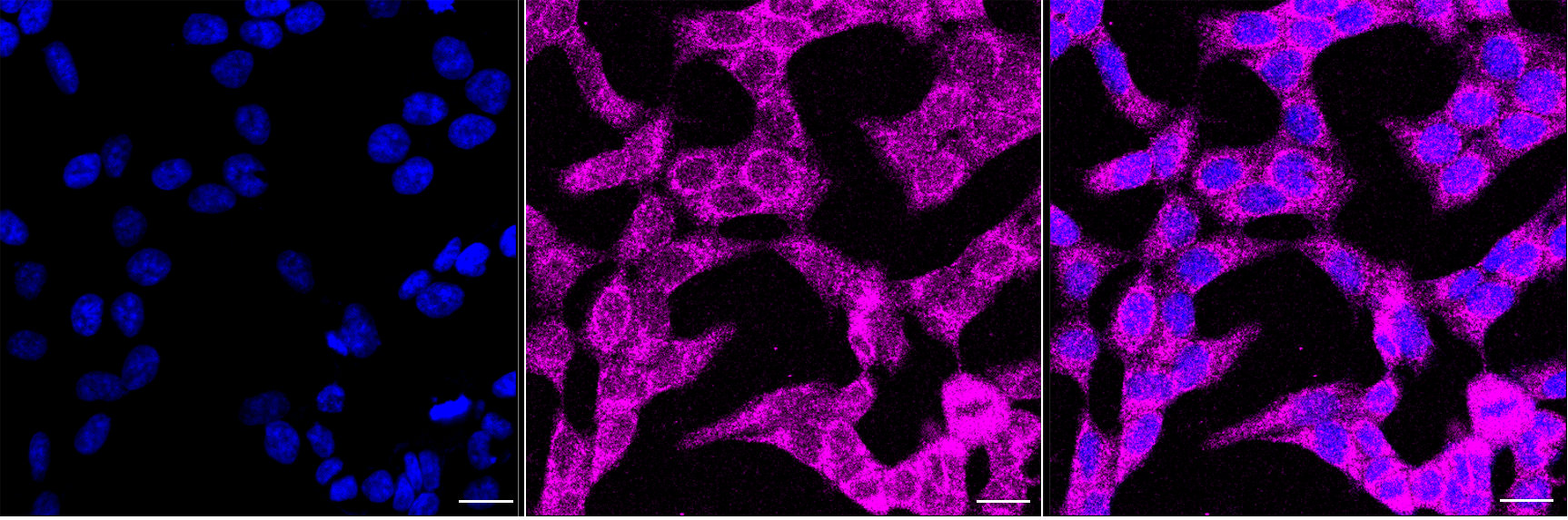Immunocytochemical staining of HAP1 cells with Epoxide hydrolase 1 antibody. Nuclei were stained blue with DAPI; Epoxide hydrolase 1 was stained magenta with Alexa Fluor? 647. Images were taken using Leica stellaris 5. Protein abundance based on laser Intensity and smart gain: Medium. Scale bar, 20 μm.