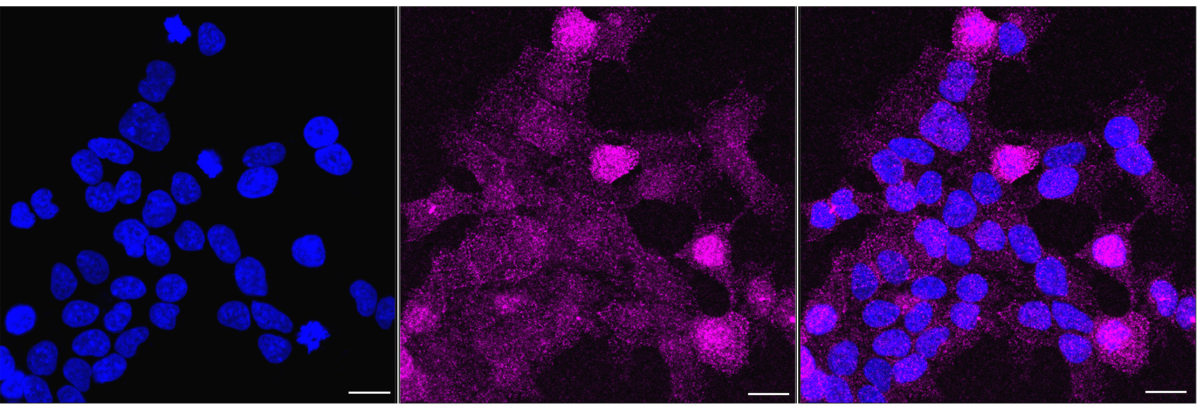 Immunocytochemical staining of Hela cells with Epsin 2 antibody. Nuclei were stained blue with DAPI; Epsin 2 was stained magenta with Alexa Fluor? 647. Images were taken using Leica stellaris 5. Protein abundance based on laser Intensity and smart gain: Low. Scale bar, 20 μm.
