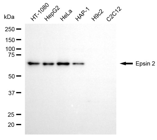 Western blotting analysis using epsin 2 antibody. Total cell lysates (30 μg) from various cell lines were loaded and separated by SDS-PAGE. The blot was incubated with epsin 2 antibody and HRP-conjugated goat anti-mouse secondary antibody respectively.