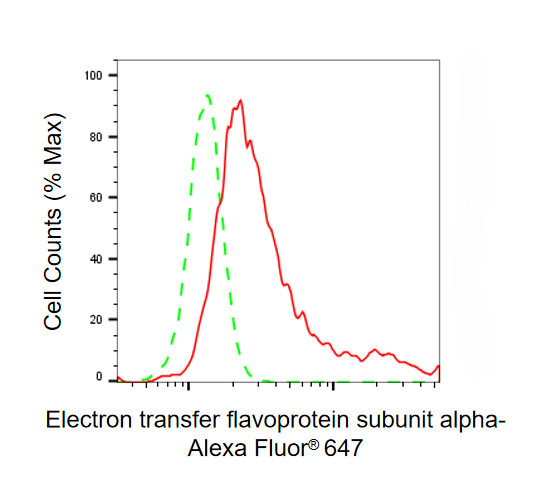 Flow cytometric analysis of Electron transfer flavoprotein subunit alpha expression in HepG2 cells using Electron transfer flavoprotein subunit alpha antibody. Green, isotype control; red, Electron transfer flavoprotein subunit alpha.