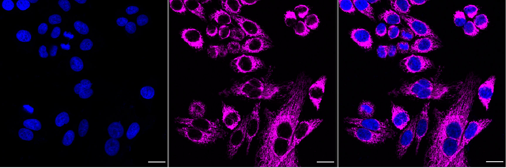 Immunocytochemical staining of HepG2 cells with Electron transfer flavoprotein subunit alpha antibody. Nuclei were stained blue with DAPI; Electron transfer flavoprotein subunit alpha was stained magenta with Alexa Fluor? 647. Images were taken using Leica stellaris 5. Protein abundance based on laser Intensity and Smart Gain: high. Scale bar, 20 μm.