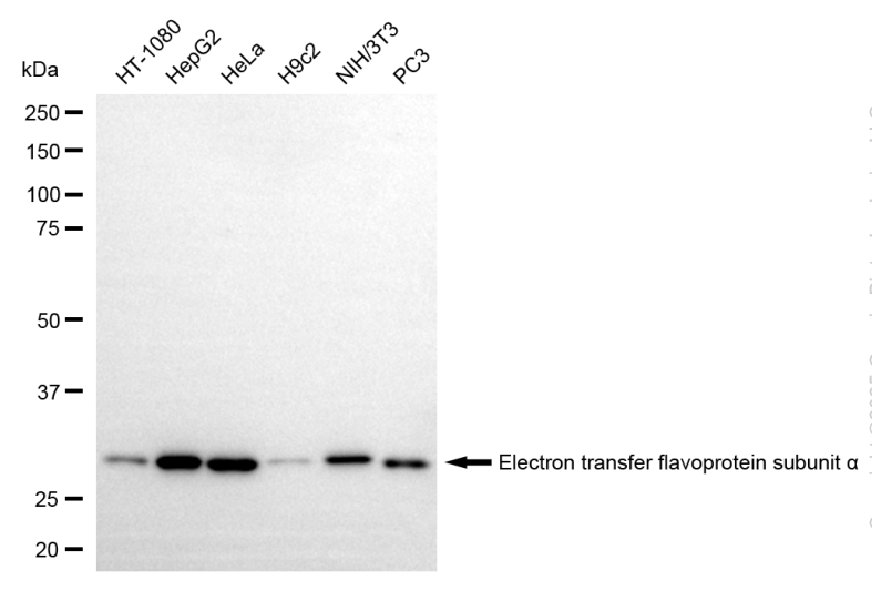 Western blotting analysis using electron transfer flavoprotein subunit alpha antibody. Total cell lysates (30 μg) from various cell lines were loaded and separated by SDS-PAGE. The blot was incubated with electron transfer flavoprotein subunit alpha antibody and HRP-conjugated goat anti-mouse secondary antibody respectively.